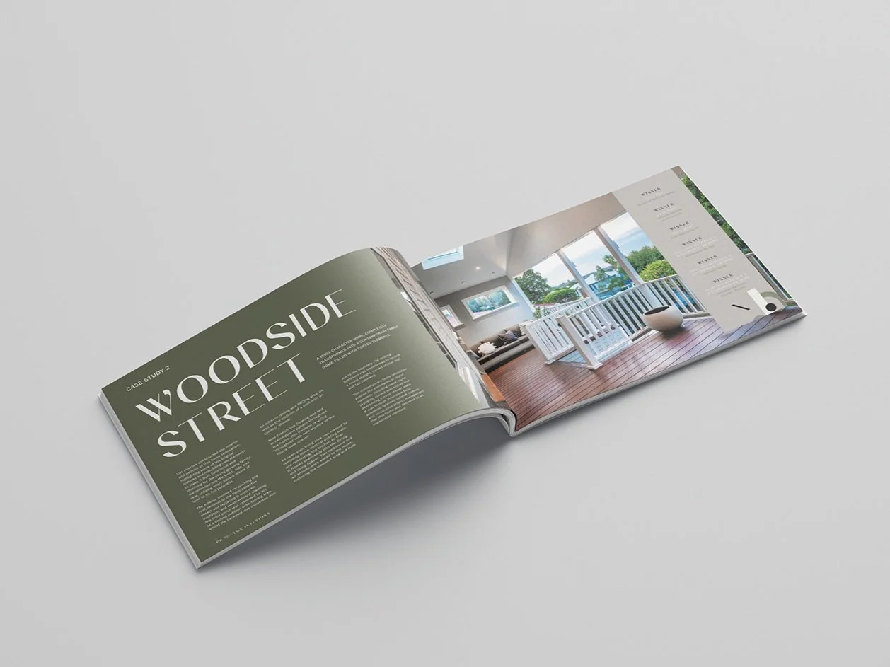 Design und Erstellung einer B2B Case Broschüre für ein exklusives Interior-Studio in Australien, das mit ausgewählten Projekten stilvolle und zeitlose Lebensräume schafft.