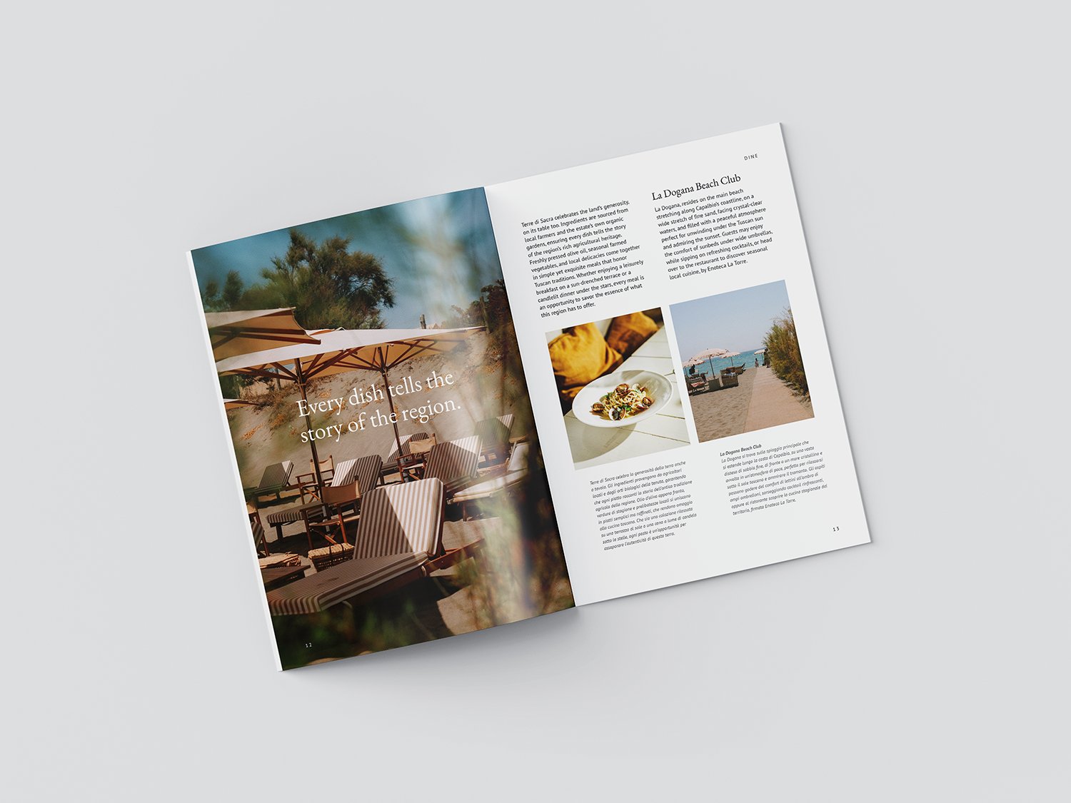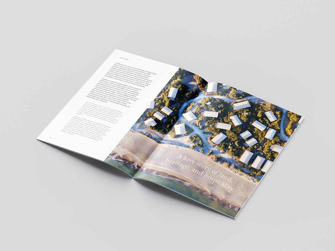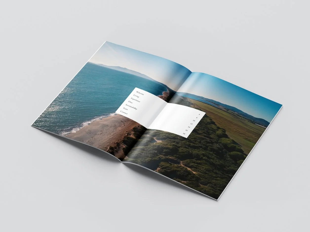 Konzeption und Gestaltung einer Urlaubsbroschüre für ein exklusives Glamping-Erlebnis am Meer in der toskanischen Natur.